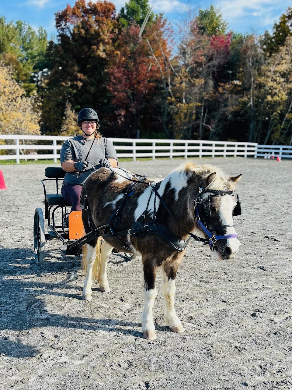 During a driving lesson, a PATH International–certified instructor guides the student in learning the skills needed to safely and confidently maneuver a horse-drawn carriage. Lessons cover harnessing, proper rein techniques, and effective voice commands, providing a hands-on opportunity to understand and respond to the horse’s communication. Driving helps students build confidence, focus, and a deeper connection with their equine partner.