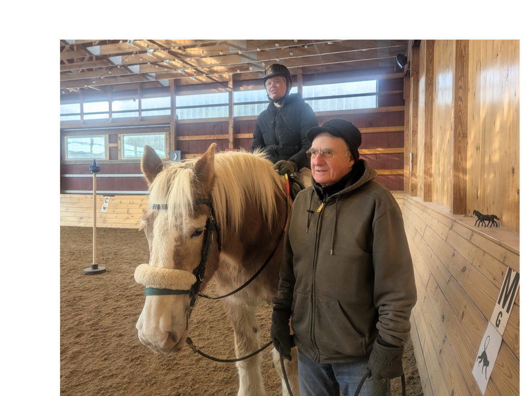 Why has Dr. Woody Baxt, a renowned surgeon (retired) chosen to volunteer at H&M since 2023? The short answer: he finds it immensely rewarding. A rider for 30+ years, Woody brings a passion for horses, plus great people skills to his role, which centers on leading the horse during the lesson to assist his rider with exercises and games. Recognizing that each horse has its’ own personality and responds differently to cues, Woody strives to create a partnership and bring out the best in both rider and horse. The goal: each session will have the maximum possible impact as well as being thoroughly enjoyable. Walking up to two miles/session provides him with fitness benefits too!